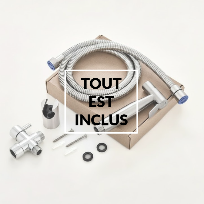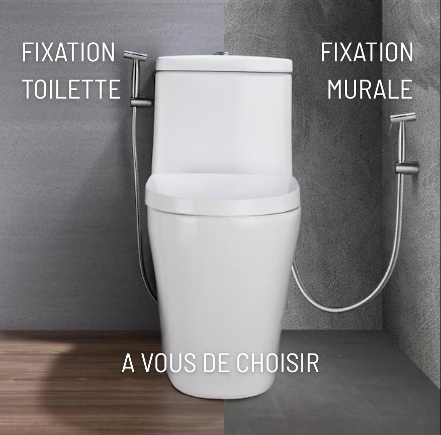 Il est possible de fixer le support de la douchette sur le mur ou plus simplement sur le réservoir de vos toilettes. Tout est fourni pour que vous puissiez choisir la configuration qui vous convient le mieux.